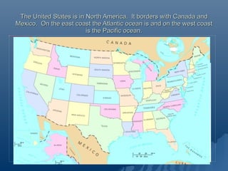 The United States is located in North America, bordered by Canada and Mexico, with coastlines on the Atlantic and Pacific oceans. It has a diverse climate and population of over 310 million people, including descendants of European, African, Asian, and Native American inhabitants. Some of the country's most famous landmarks include the Statue of Liberty in New York and the White House and Capitol building in Washington D.C.