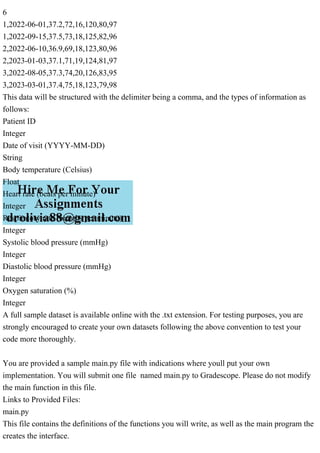 This document outlines the creation of a health information system that uses biomedical signals to maintain electronic medical records for patients, utilizing a plain-text file for data input. It describes various backend functionalities, including data reading, statistical analysis, patient data management, and follow-up identification based on vital signs. The assignment requires implementing specified functions in a provided Python file, with guidance on how to structure and handle patient data and interactions.
