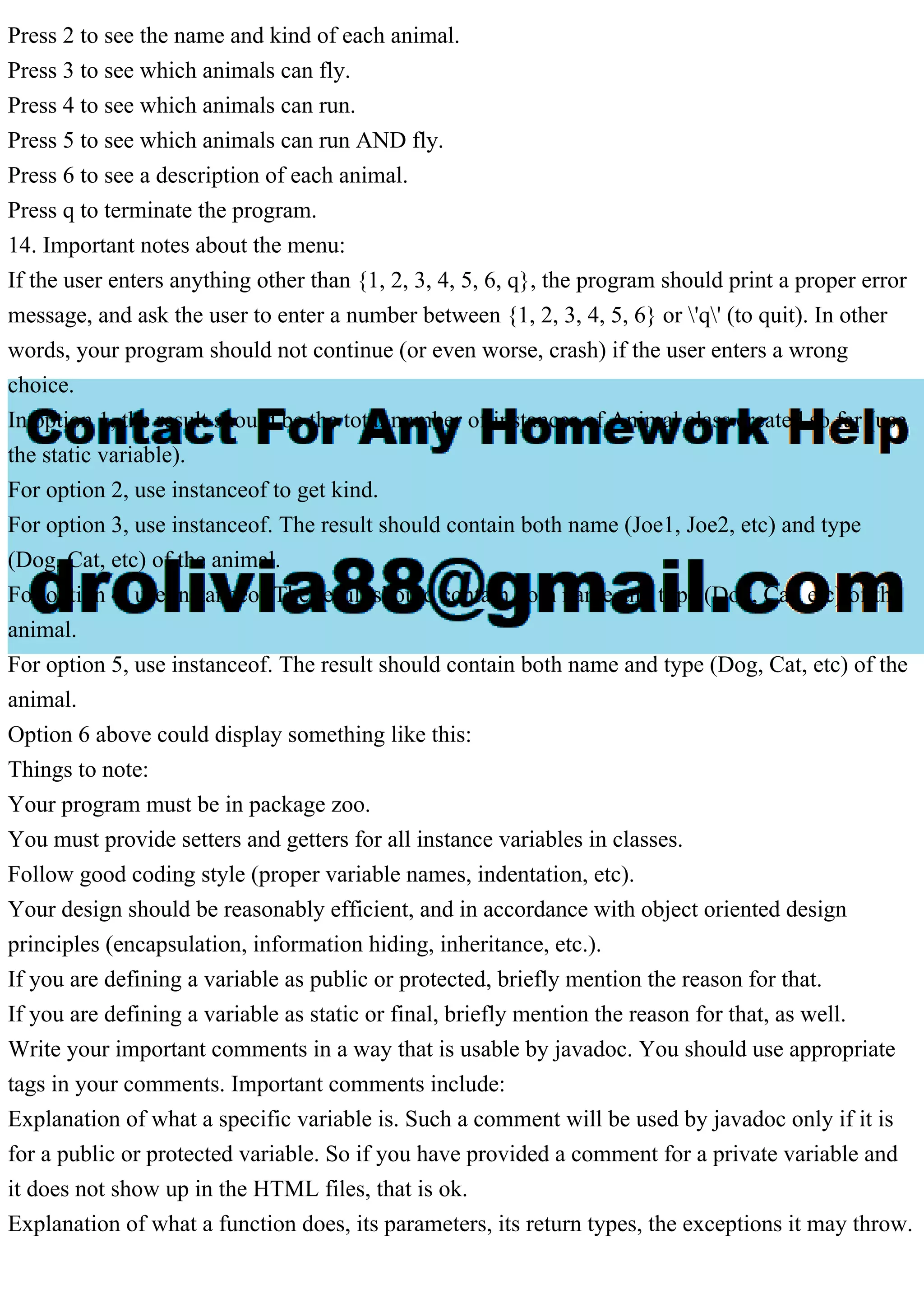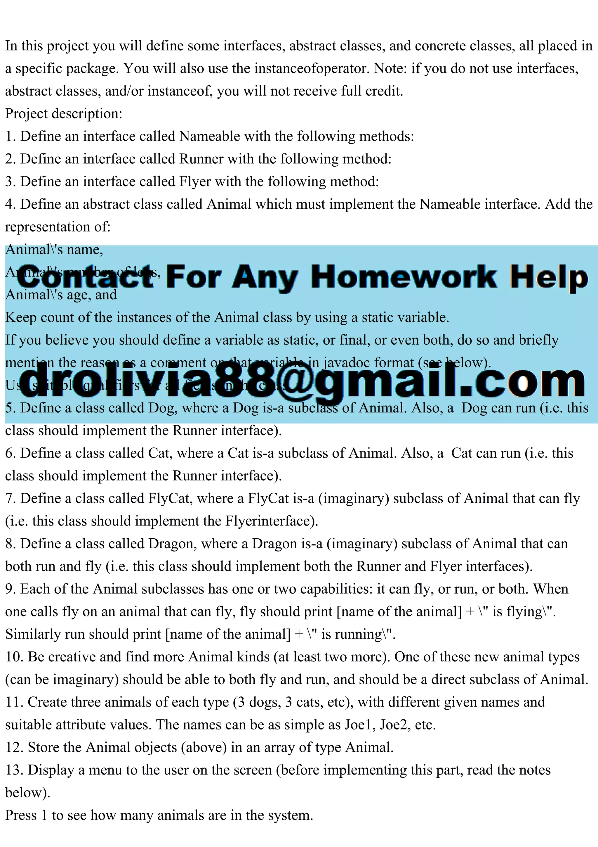 The document outlines a programming project focused on defining a package called 'zoo' that includes interfaces, abstract classes, and concrete classes representing different animals. It specifies the creation of an interface for nameable attributes, methods for running and flying, and an abstract class called 'animal' with relevant properties and a static instance counter. The project also describes user interaction through a menu to query information about the different animal types created from subclasses like dog, cat, flycat, and dragon.