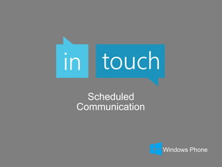 This document discusses an app called "In Touch" for Windows Phone that allows users to schedule text messages and reminders to be sent at future times. It outlines the problem the app solves by letting people send messages when they will not forget rather than immediately. It then briefly describes the app's demo, features like grouping and multiple modes, and potential competitors. It concludes by considering improvements like using WCF for email and redesigning the back-end, and provides a link for proof of the app in the Windows Phone store.