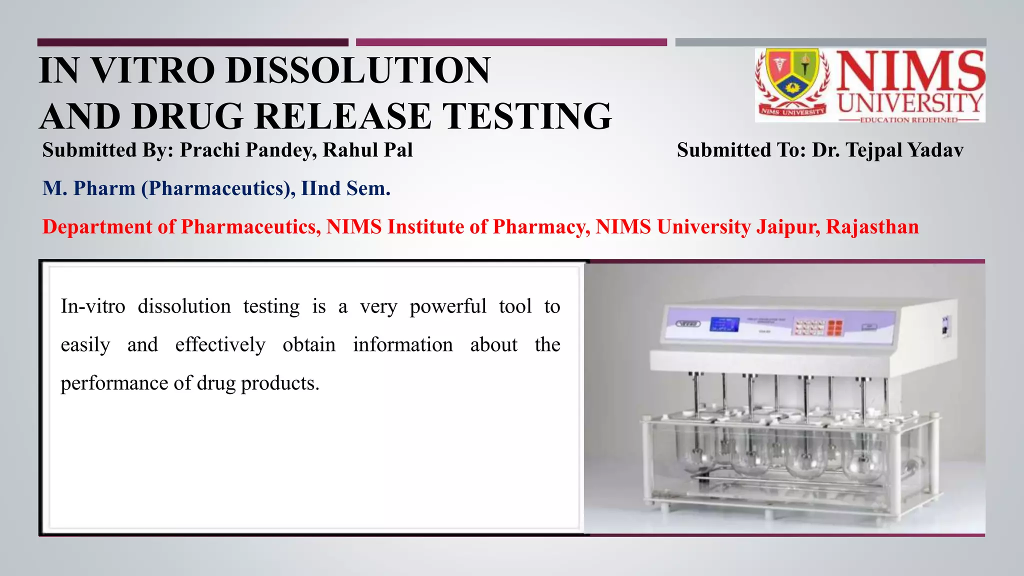 The document discusses in vitro dissolution and drug release testing, highlighting its importance for assessing the performance of drug products regarding bioavailability and therapeutic effectiveness. It outlines various dissolution methods, including non-sink and sink techniques, and describes specific methodologies like the Klein solvmeter, Nelson hanging pellet method, and rotating flask apparatus. Additionally, it covers the classifications of drug release such as immediate, sustained, and controlled release, along with in vitro testing procedures used to evaluate drug release profiles.