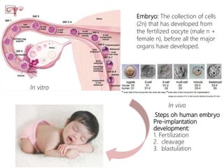 The document discusses the steps and techniques involved in assessing human embryos during pre-implantation development, focusing on criteria such as chromosomal integrity, genomic activation, metabolic activity, and morphological assessment. Key methods include preimplantation genetic diagnosis (PGD) and non-invasive techniques that evaluate embryo viability, which is crucial for successful IVF. The document also highlights the importance of specific developmental stages and assessment criteria for optimizing embryo selection and improving implantation rates.