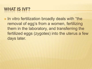 This document summarizes in vitro fertilization (IVF) and embryo transfer. [1] IVF involves removing eggs from a woman, fertilizing them with sperm in the lab, and then transferring the fertilized eggs (zygotes) into the uterus a few days later. [2] Reasons for IVF include infertility, which is increasingly prevalent worldwide. [3] The history, methodology, success rates, factors, and limitations of IVF are discussed over several stages: ovarian stimulation and monitoring, egg retrieval, fertilization, embryo transfer, and potential outcomes.