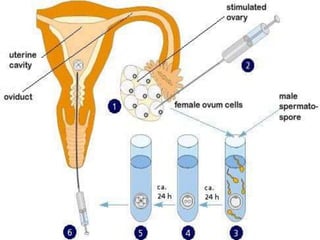 This document provides an overview of in vitro fertilization (IVF). It discusses that IVF involves fertilizing an egg with sperm outside of the body in a laboratory dish. The first successful IVF birth was in 1978 in England. The document outlines the basic IVF process which includes hormonal treatment of the female, egg retrieval, fertilization and embryo culture, and embryo transfer. It also discusses the history of IVF, indications for IVF including tubal disease and male factor infertility, factors that affect IVF success rates like maternal age, and potential side effects and risks of IVF treatment.