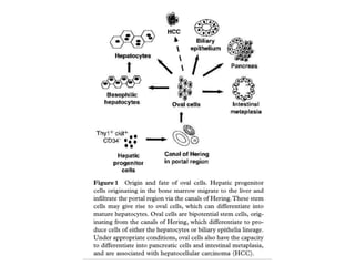 This study investigated the proliferation characteristics and tumorigenic potential of oval cells, the proposed stem cells of the liver. Male rats were fed a choline-deficient diet to induce oval cells, which were then isolated and cultured over 100 passages over 2 years. The oval cells were analyzed using flow cytometry and markers to observe their immunophenotype, proliferation ability, and differentiation potential. When xenografted into immunodeficient mice, the oval cells did not spontaneously transform into cancer-initiating cells. This suggests hepatic oval cells may serve as a safe cell source for future cell therapy and studying liver carcinogenesis.