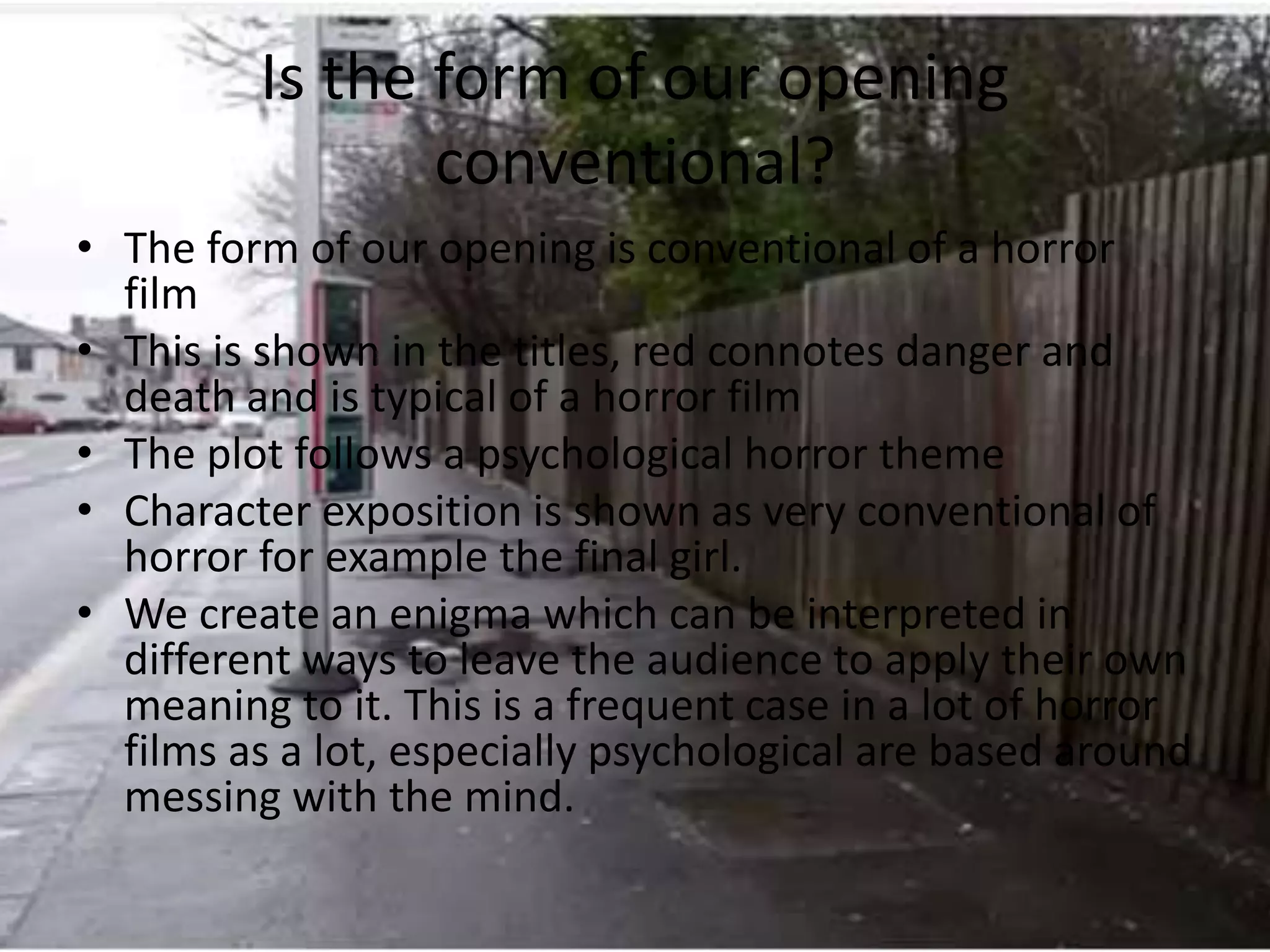The document discusses how the media product conforms to conventions of psychological horror films. It notes that the opening titles use red text, the plot involves murder and foreshadowing, costumes are all black, and lighting creates a scary atmosphere. Character exposition and roles like the final girl also follow horror conventions. The document analyzes how elements like sound, camera work, editing, typography, and color/visual techniques conform to typical techniques used in horror films to build suspense, tension, and engage audiences. However, it notes the representation of gender roles could be seen as conveying outdated ideologies.