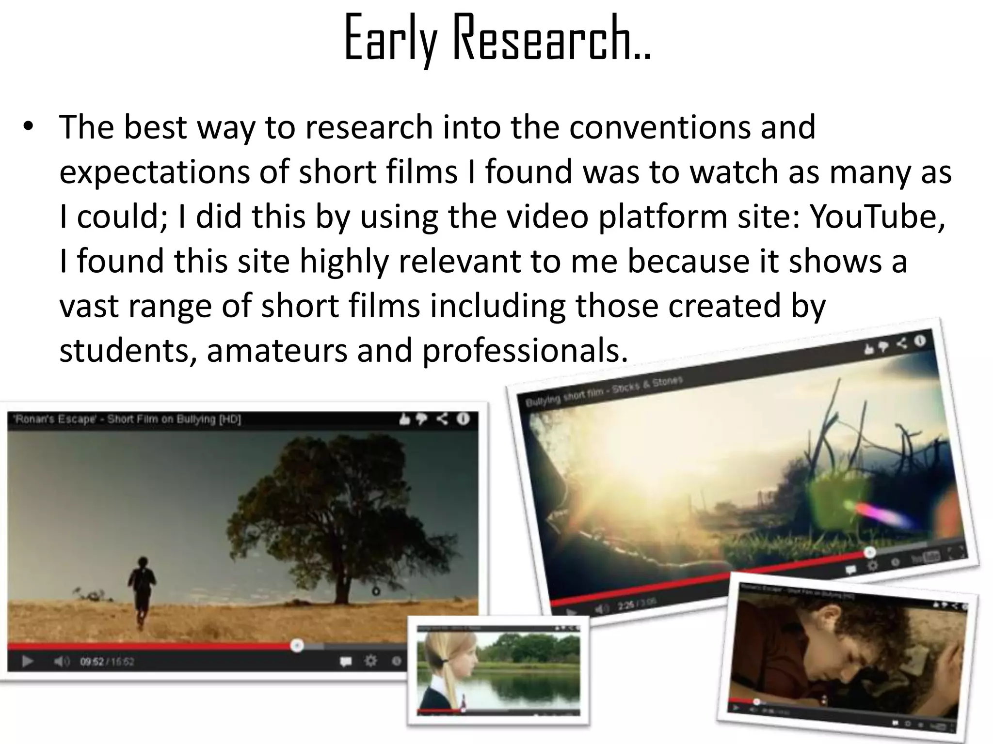 The document discusses the conventions of short films that the author researched and analyzed. Some key conventions included durations of less than 5 minutes, 1-2 main characters, simple plots, realistic settings, inclusion of twists, and minimal equipment. The author developed their short film about bullying by following many of these conventions, such as duration and characters, but also challenged some, like not including suicide which is common in bullying films. Music was given more importance than typical. Overall, the author believes their film effectively communicates its message through its adherence and adjustments to short film conventions.