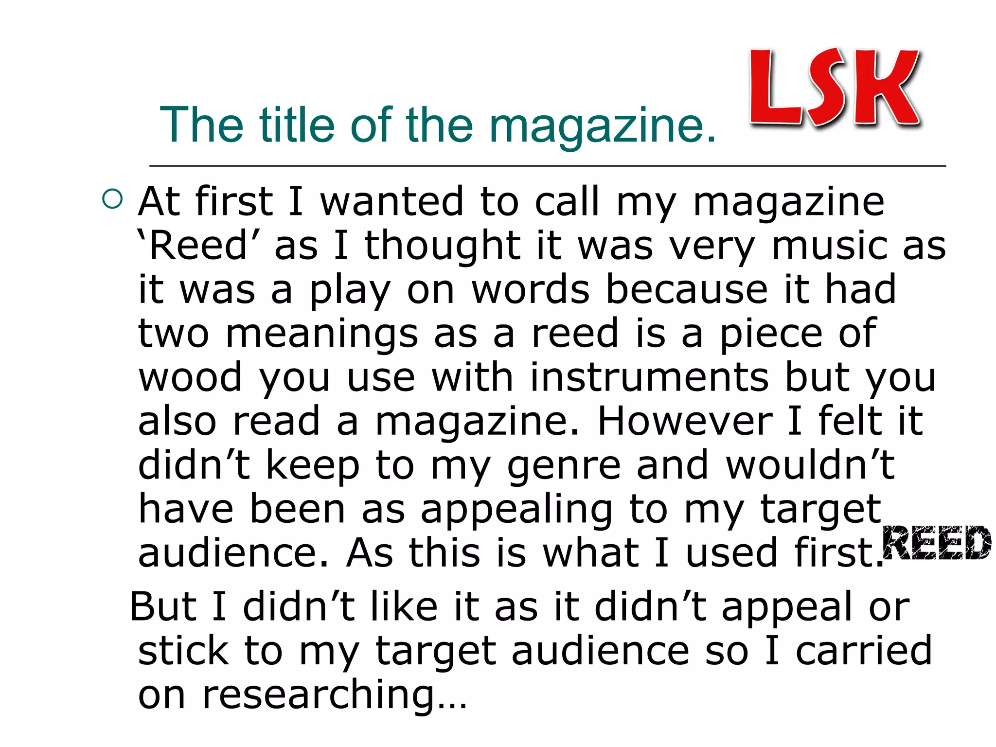 The document discusses the development of a magazine created for a school project. It describes the process of choosing a title, developing the visual style through photos and layout, and determining the written content. Key decisions included choosing a young female singer as the focus, using a red, white, and black color scheme, and modeling some elements after existing popular music magazines like Q and Billboard to appeal to teenage readers. The magazine was meant to emulate real music publications while tailored for its target demographic.