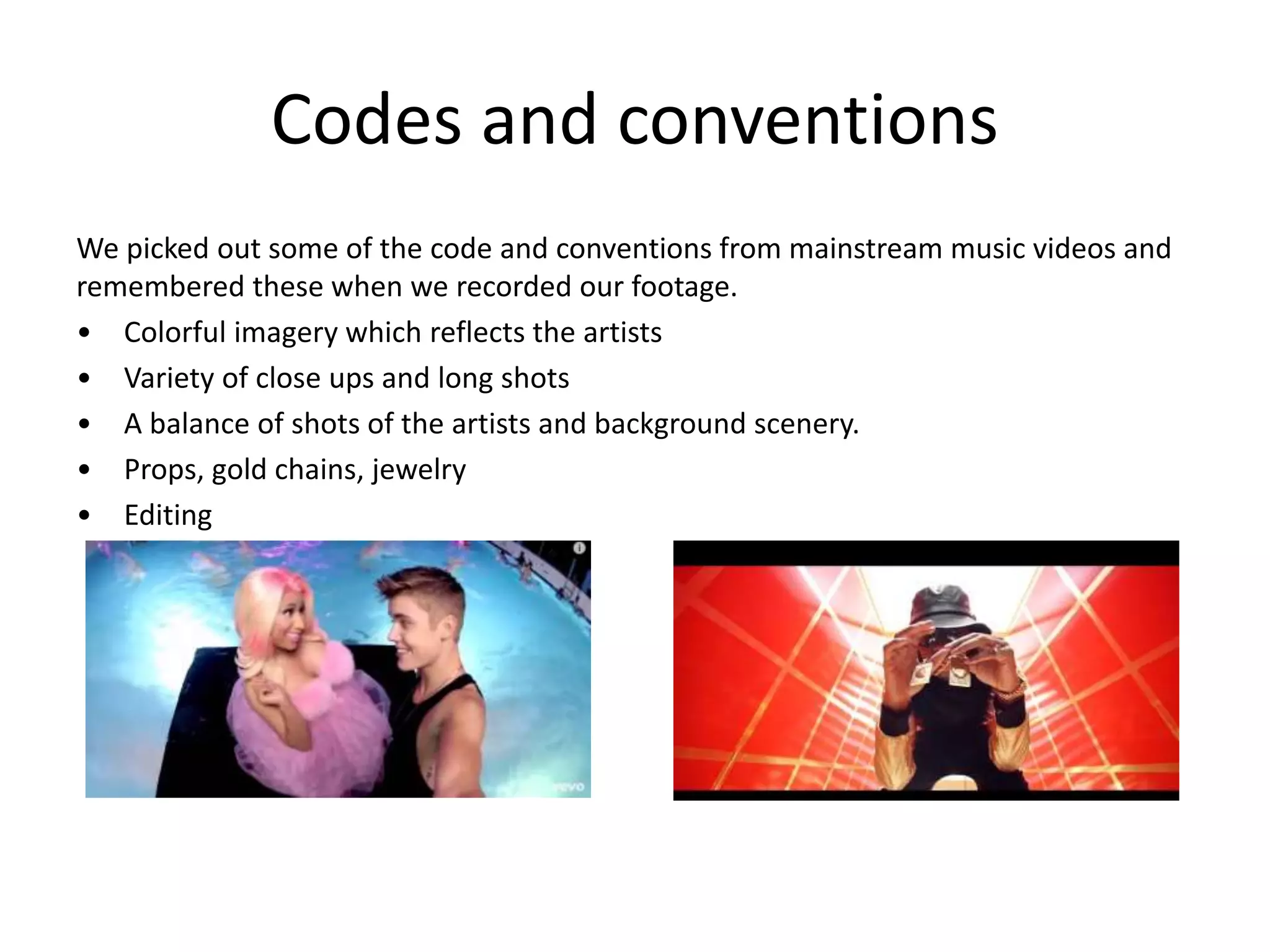 This document discusses how a student's media product utilizes and develops conventions of real music videos and album packaging. It examines the use of colorful imagery, varied shots, props, editing, performances, and layout in the student's music video and digipak design. Conventions from mainstream music were considered like close-ups of artists, fast-paced editing, and natural poses in digipak photos. The goal was to create a professional product that reflected the artists while developing conventions suitably for the style of music.