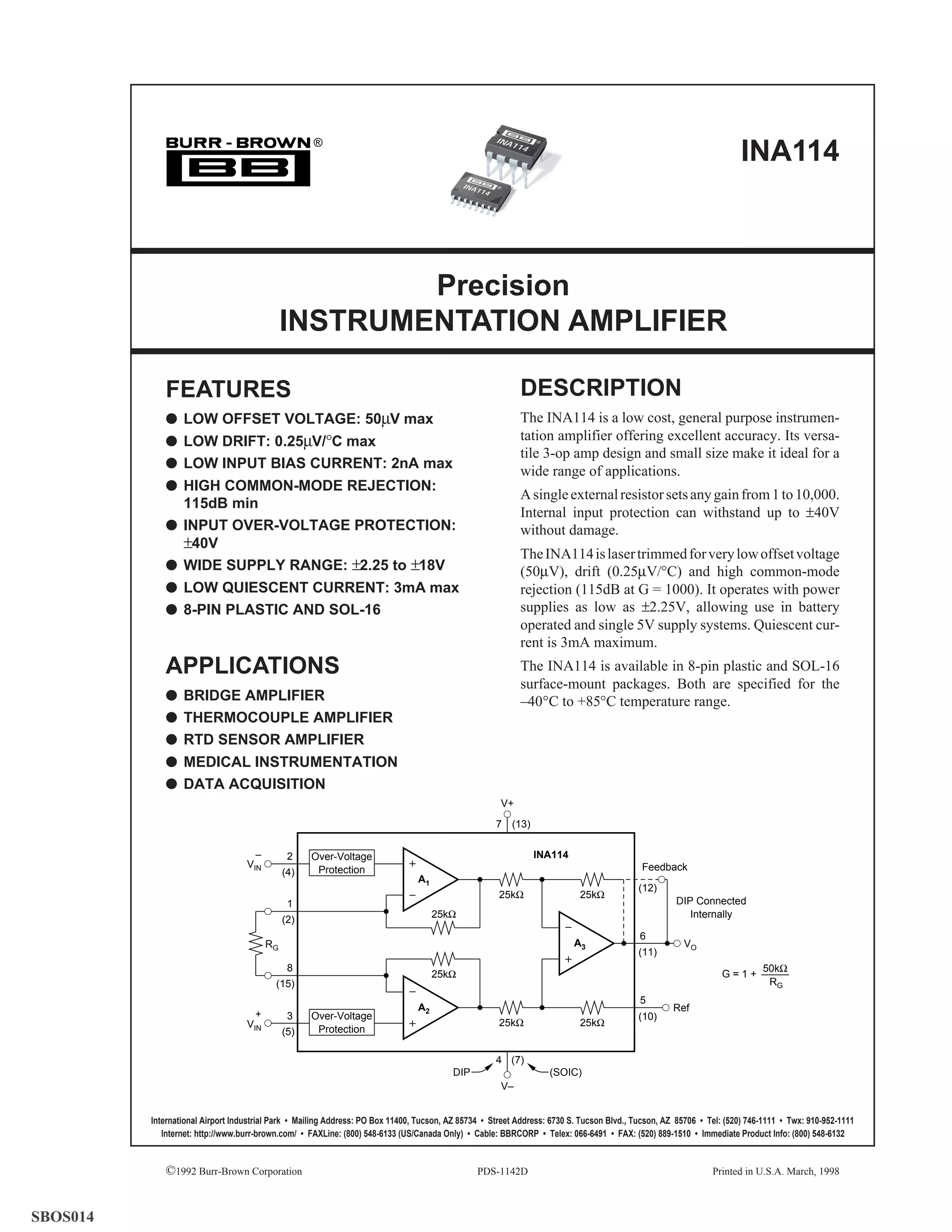 The INA114 is a low-cost, versatile instrumentation amplifier that offers excellent accuracy. It has features like low offset voltage of 50uV max, low drift of 0.25uV/°C max, and high common-mode rejection of 115dB min. An external resistor can set the gain from 1 to 10,000. It operates on a wide supply range of ±2.25V to ±18V with low power consumption of 3mA max.