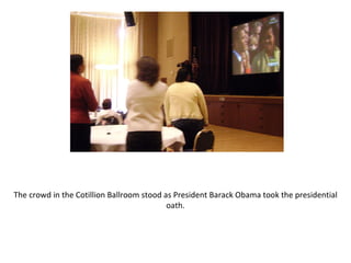 Vice President Joe Biden was sworn in during a ceremony where President Barack Obama took the presidential oath. The crowd, including students and families, reacted emotionally to the historic event and Obama's speech outlining his political agenda. Obama highlighted his commitments to responsibly transition from Iraq and work towards peace in Afghanistan.