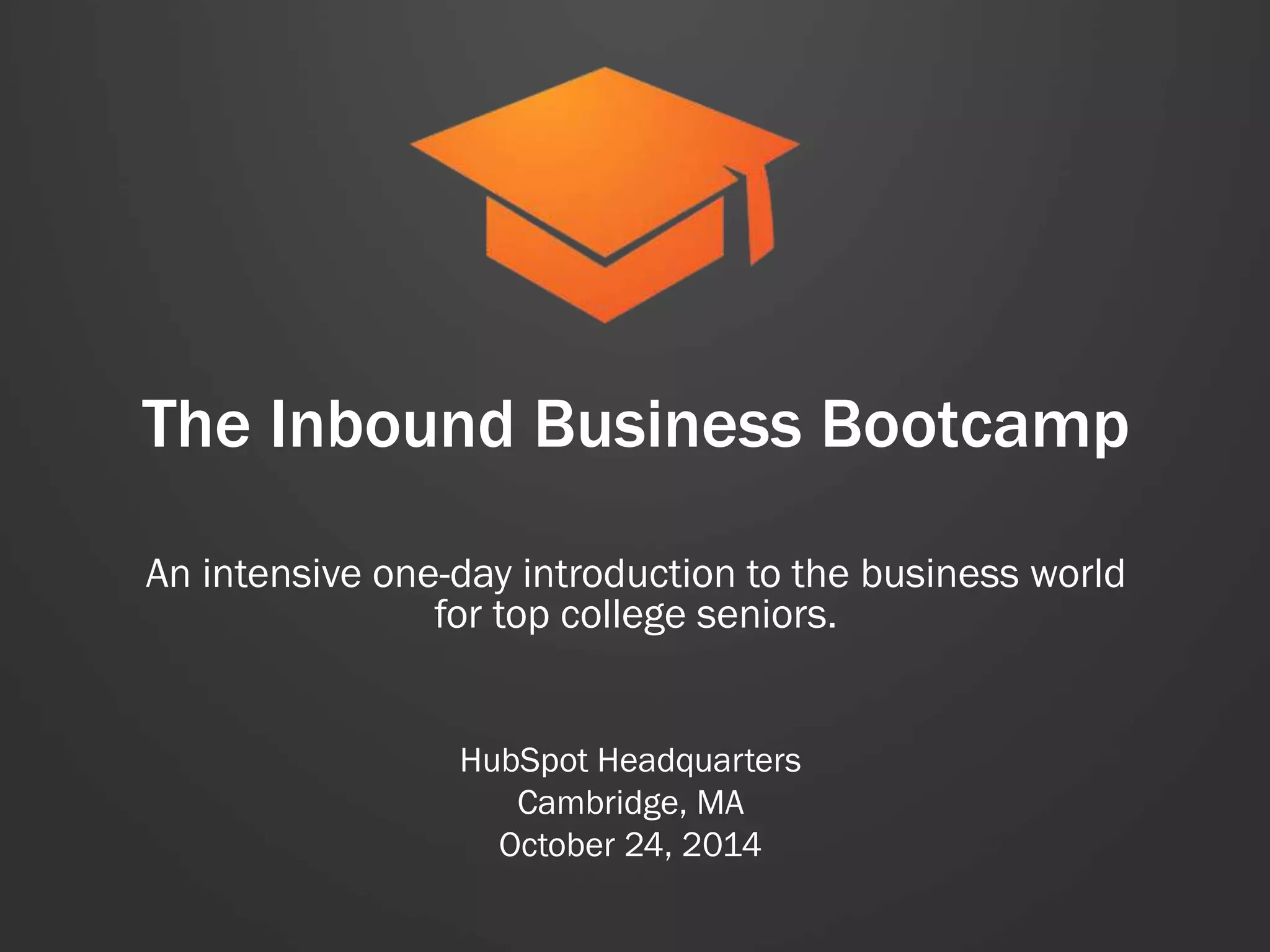 The Inbound Business Bootcamp is a free, one-day introduction to the business world for top college juniors and seniors, hosted by HubSpot in Cambridge, MA, on February 20, 2015. The program seeks talented undergraduates interested in business careers at technology companies, emphasizing qualities like excellence and passion rather than prior experience. Interested students can apply through the provided link, but the bootcamp is not open to engineering-focused participants.