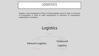 The document discusses inbound logistics, which refers to the process of procuring materials and bringing them into a company. It involves activities like sourcing suppliers, purchasing goods, transportation, receiving shipments, and inventory management. The document provides an example of how inbound logistics works for a fashion company procuring fabric and other supplies. It also outlines some common challenges in inbound logistics like shipping inefficiencies, lack of shipment visibility, demand fluctuations, and unreliable suppliers. The document concludes with recommendations for improving inbound logistics such as analyzing processes, developing strategies, strengthening supplier relationships, and implementing transportation and warehouse management systems.