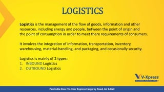 Logistics involves managing the flow of goods and resources between the point of origin and consumption. It integrates transportation, inventory, warehousing and packaging. Inbound logistics receives, stores and distributes incoming materials, with objectives like ensuring prompt availability, accurate documentation, meeting specifications and safe storage. Outbound logistics handles outgoing goods and materials with objectives like meeting customer demand, balancing supply and demand, reducing costs and maintaining transparency.