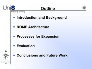 The document describes ROME, an architecture that optimizes DHT-based peer-to-peer networks like Chord. ROME aims to reduce message costs by keeping the ring size just large enough to support current workload, rather than scaling with total network nodes. Each node monitors its workload and performs add or replace operations to dynamically adjust the ring size as needed. Simulation results show ROME achieves smaller average ring sizes, lower hop counts, and reduced query failure rates compared to Chord under fluctuating workloads and node lifetimes.
