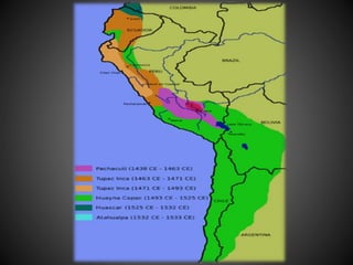 The Inca civilization originated in Peru in the 13th century and built a vast empire through military conquest. By the 15th century, the Inca Empire spanned much of western South America and was organized into four regions with Cuzco as its capital. The Incas had no written language but used knotted strings called quipus to record information. They developed advanced architecture, road systems, agriculture and other innovations without the use of wheels or iron. The Inca Empire was the largest in pre-Columbian America until its collapse following the Spanish conquest in the 16th century.