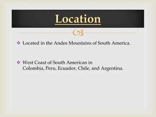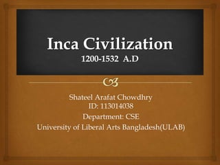The document discusses the history of the Inca Empire, detailing its founding by Manco Cápac in the 12th century, expansion under leaders like Pachacuti, and the construction of Machu Picchu. It highlights societal structures, agricultural practices, labor systems like mita, and religious beliefs, including human sacrifices. The narrative concludes with the account of the Spanish conquest led by Francisco Pizarro, civil conflicts, and the devastating impact of smallpox on the Inca population.