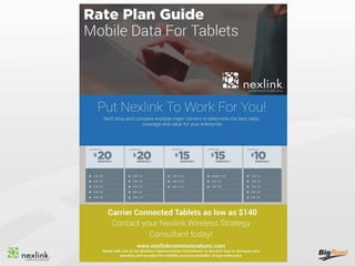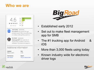 This live webinar discusses in-cab technology options for trucking companies. It features presentations by Terry Frey from BigRoad, a fleet management app company, and Peter Schmidt from Nexlink Communications, a wireless device supplier. The webinar covers how smartphones and apps are changing trucking through benefits like electronic logs, route planning, and bypassing weigh stations. It also highlights Nexlink's products like mobile devices, accessories, and trucking bundles to bring connectivity to trucks. The webinar aims to show where trucking technology is headed, such as electronic logging devices that connect to vehicles.