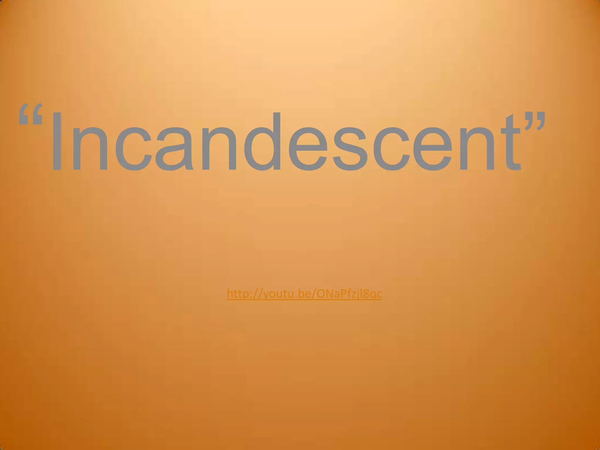 The document defines and provides the etymology of the word "incandescent". It begins by listing definitions from the Oxford English Dictionary describing something that glows brightly from heat or intense feeling. It then traces the word to its Latin roots of "kindle" and "become white" or "to shine". Subsequent definitions from dictionaries and a breakdown of the word's morphemes provide further linguistic context for the original and current meaning of "incandescent" as glowing or shining intensely from heat or passion.