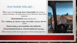 The document describes a virtual reality gaming system integrated into a car, allowing players to use real car features like steering, lights, and brakes during gameplay. Players can switch between driving and gaming modes via a keychain, with a digital assistant guiding them through challenges that are based on real-world driving routes. The system also includes options for individual and multiplayer modes, with immersive environments and feedback through the car's systems.