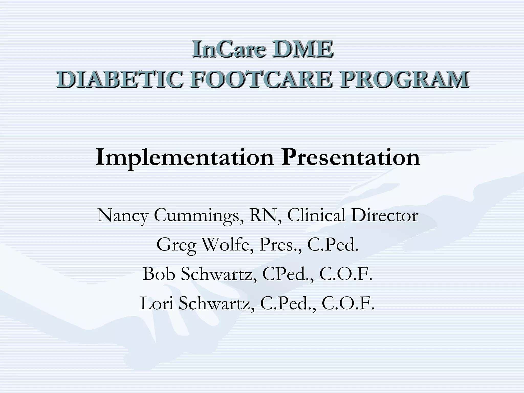 This document outlines InCare DME's diabetic footcare program. It discusses Medicare coverage of therapeutic shoes and inserts, risks factors for diabetic foot complications, proper foot assessment and care, the fitting process for therapeutic shoes, and follow up with patients. Key points include that Medicare covers one pair of therapeutic shoes and 3 pairs of inserts per year to help prevent foot complications for diabetics, which can include ulcers, infection, and amputation. A proper fitting process assesses foot risks and ensures shoes and inserts are properly fitted to support high-risk feet.