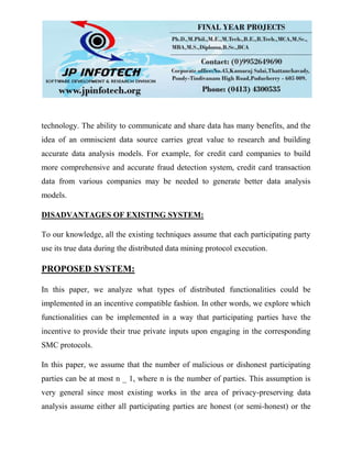 This document discusses incentive compatible privacy-preserving data analysis. It proposes techniques that would motivate participating parties in data analysis tasks to provide truthful private inputs. Key theorems are developed to analyze what types of distributed data analysis functionalities could be implemented in a way that parties are incentivized to provide their true private data, such as certain data analysis tasks being in the best interest of parties to tell the truth. The number of dishonest parties is assumed to be at most one less than the total number of parties engaged in the analysis.