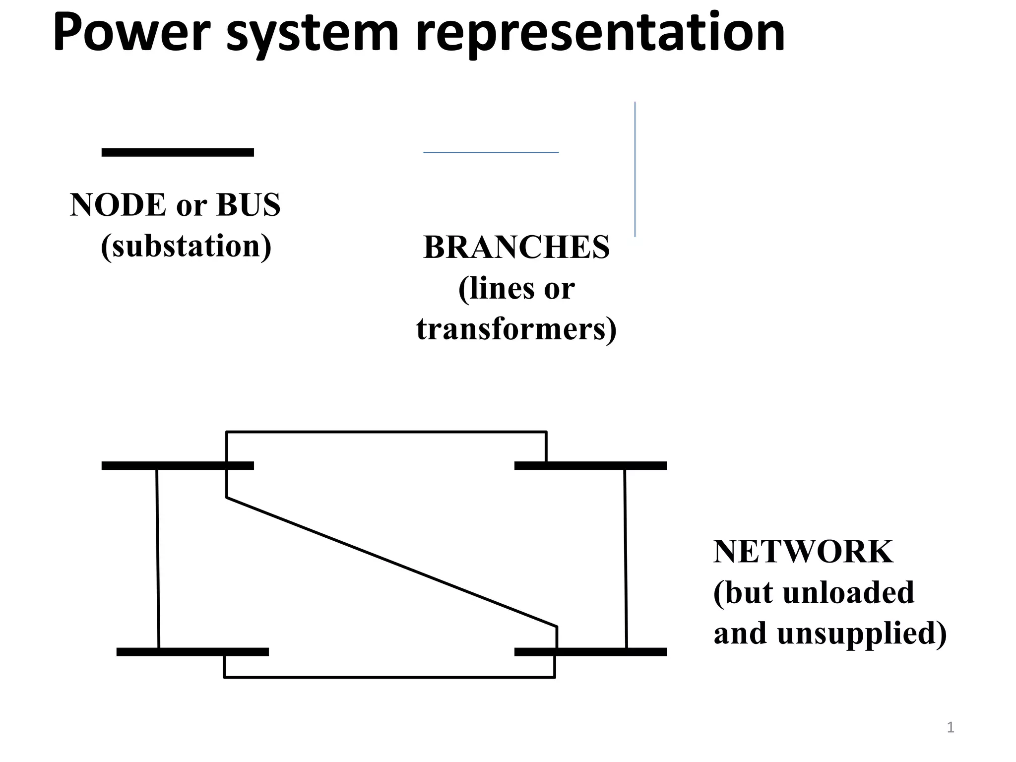 1) Branches are modeled as admittances to relate voltage and current. The admittance matrix (Y-bus) is formed with diagonal elements equal to the sum of incident branch admittances and off-diagonals equal to the negative of branch admittances.