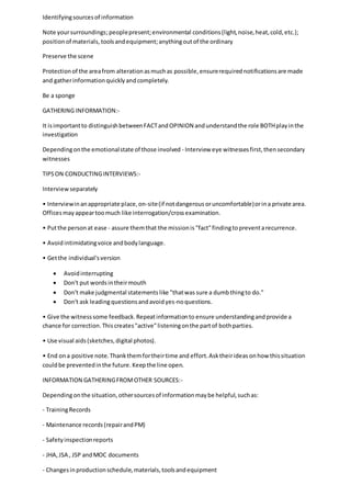The document outlines the steps and techniques for effectively investigating incidents. Some key points include: