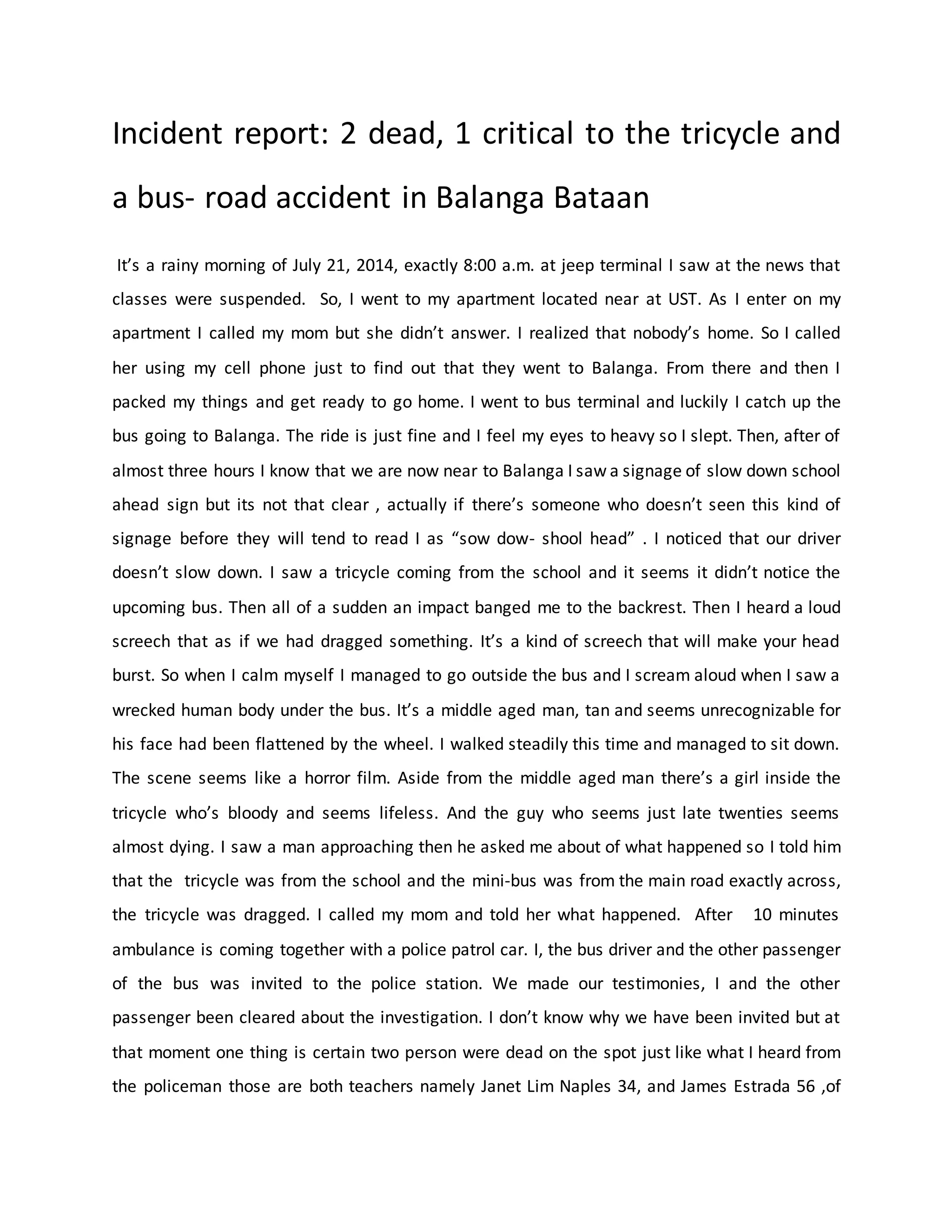 Two teachers were killed and the tricycle driver was left in critical condition due to a road accident involving a bus and a tricycle in Balanga, Bataan. The witness reported heavy rain that day which made the road slippery. The bus driver failed to slow down near the school area despite unclear signage. The witness called for help and provided testimony to police about the incident. The witness believes clearer signage, traffic enforcement, and first aid training for enforcers could help prevent future accidents.