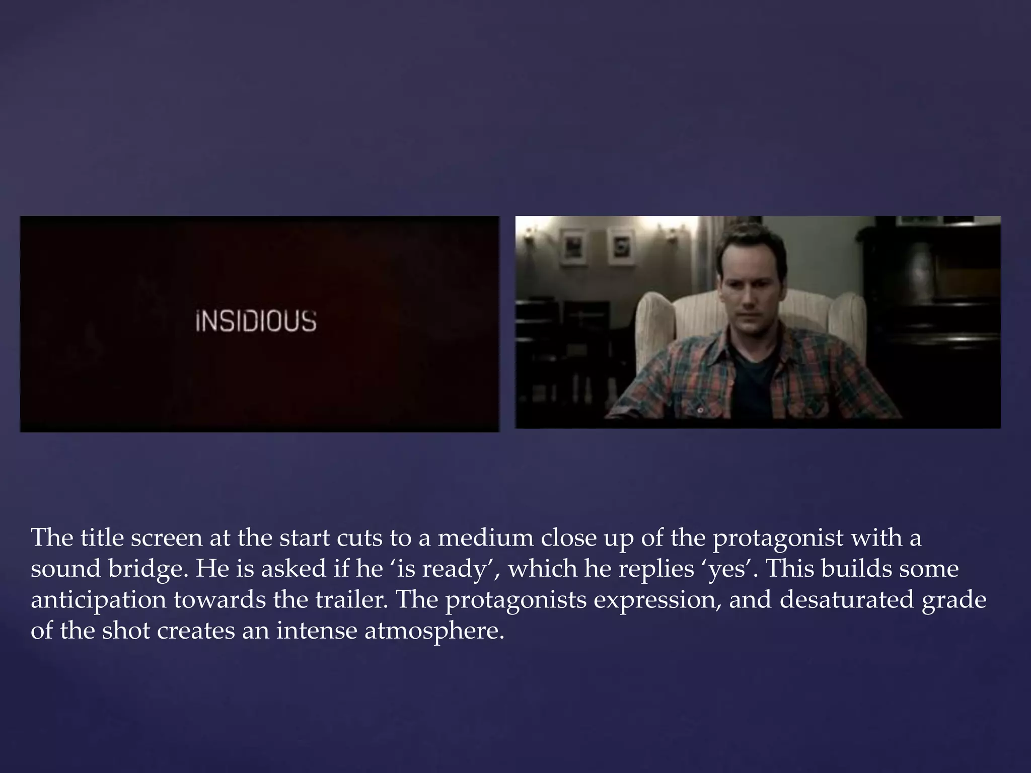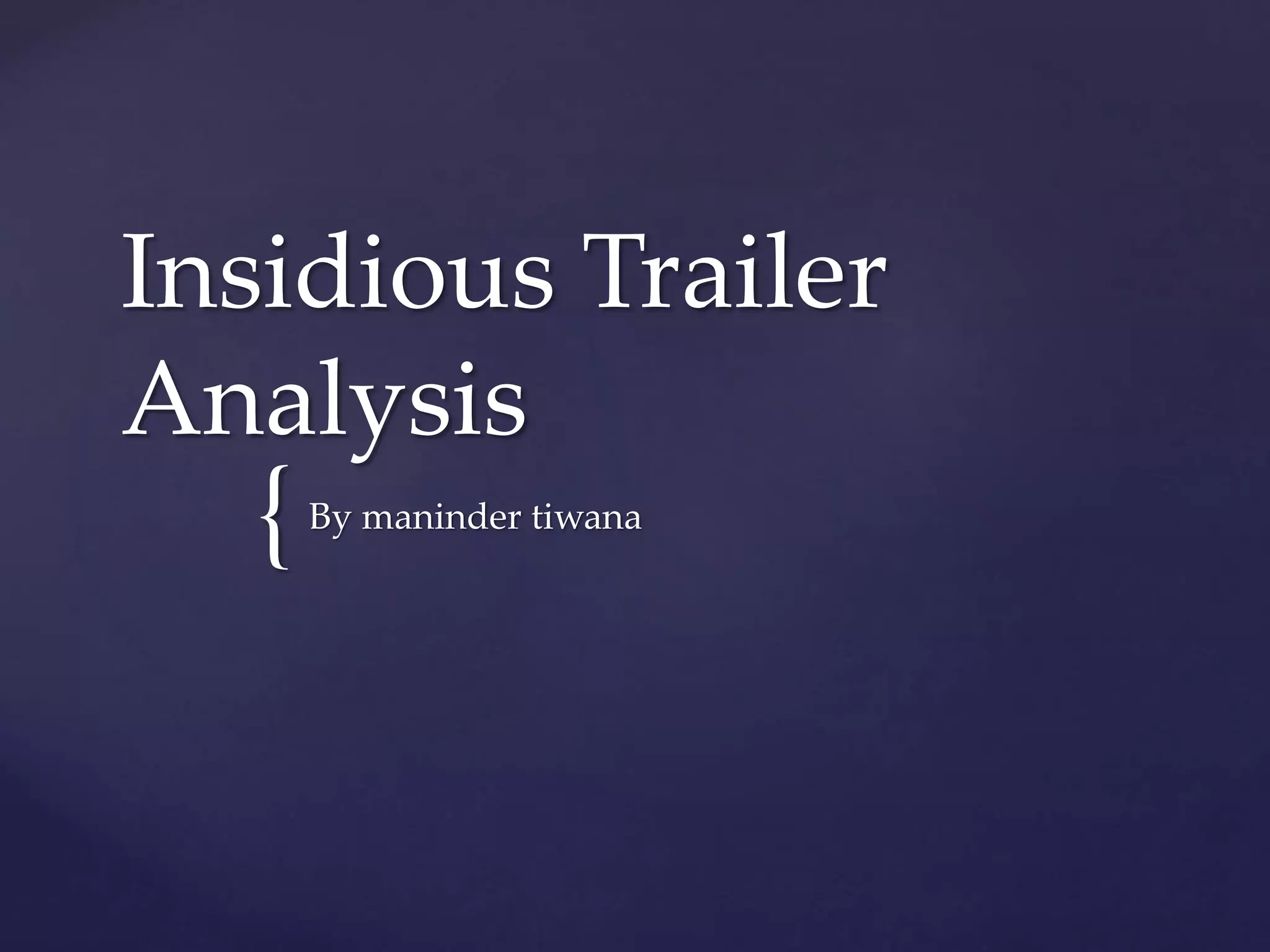 The document provides an analysis of the trailer for the film "Insidious". It summarizes key shots and editing techniques used in the trailer to build tension, atmosphere, and reveal plot details. Shots of the family in their new home are intercut with unnatural movements and shadows that connote the supernatural. Close-ups of characters' fearful reactions reveal something is haunting the family. The trailer establishes that the antagonist is the house itself, which seems alive and watching the family.