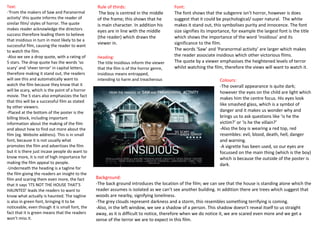 The poster uses various techniques to attract and scare viewers. It centers a young boy with light eyes that draw the viewer in, suggesting he is important but also in danger. Text promotes the film's directors' success in horror and a 5-star review emphasizes sheer terror. A dark background with the boy in red isolates the house and foreshadows something terrifying. Together, these visual and textual elements aim to intrigue viewers and make them want to watch the film to understand the entrapping insidious forces hinted at.