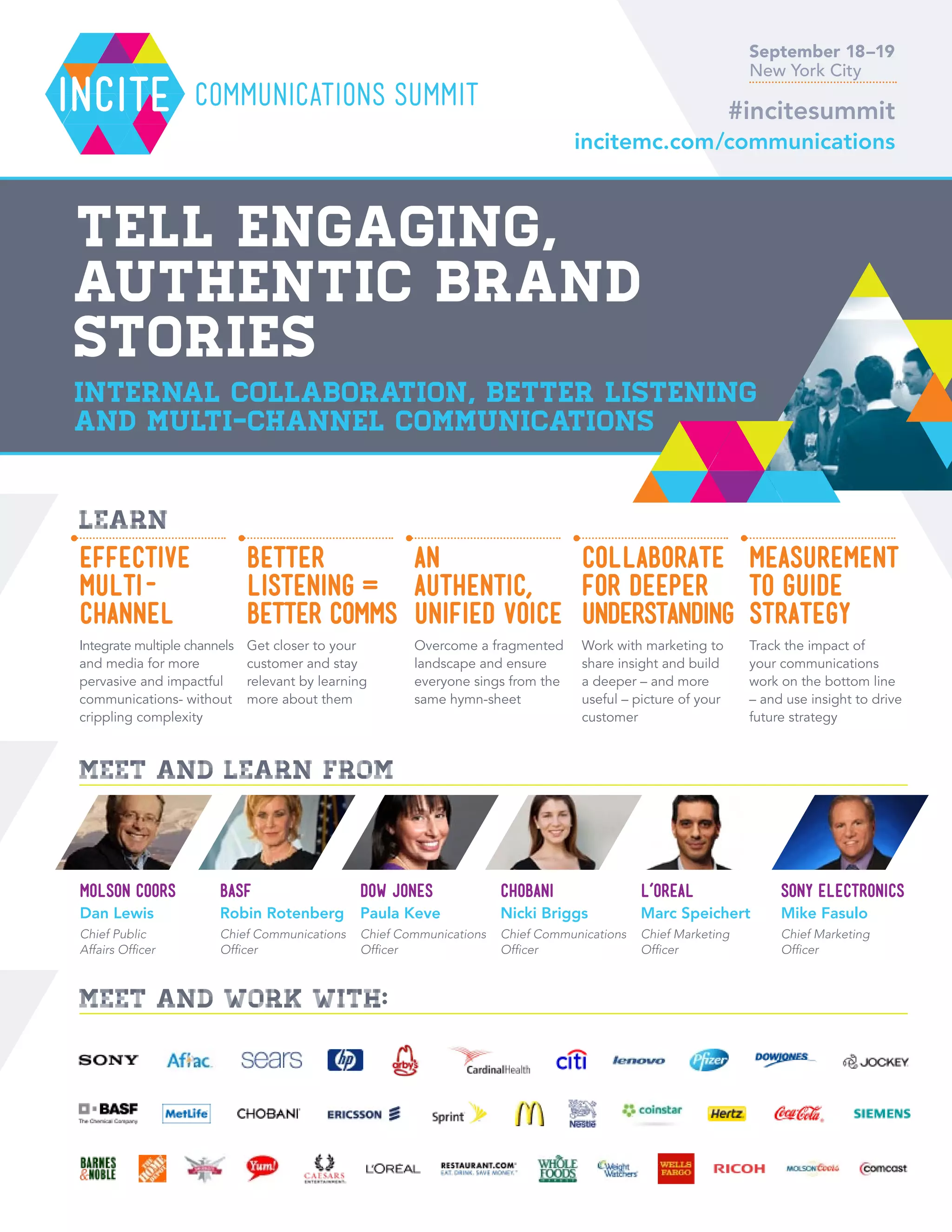 The document outlines an upcoming communications summit focused on enhancing corporate communications strategies through collaboration, multi-channel engagement, and storytelling. Attendees will hear from top executives, participate in relevant discussions, and work on practical solutions to improve communication effectiveness. Key themes include customer centricity, measurement of communications impact, and evolving corporate culture to better meet customer needs.