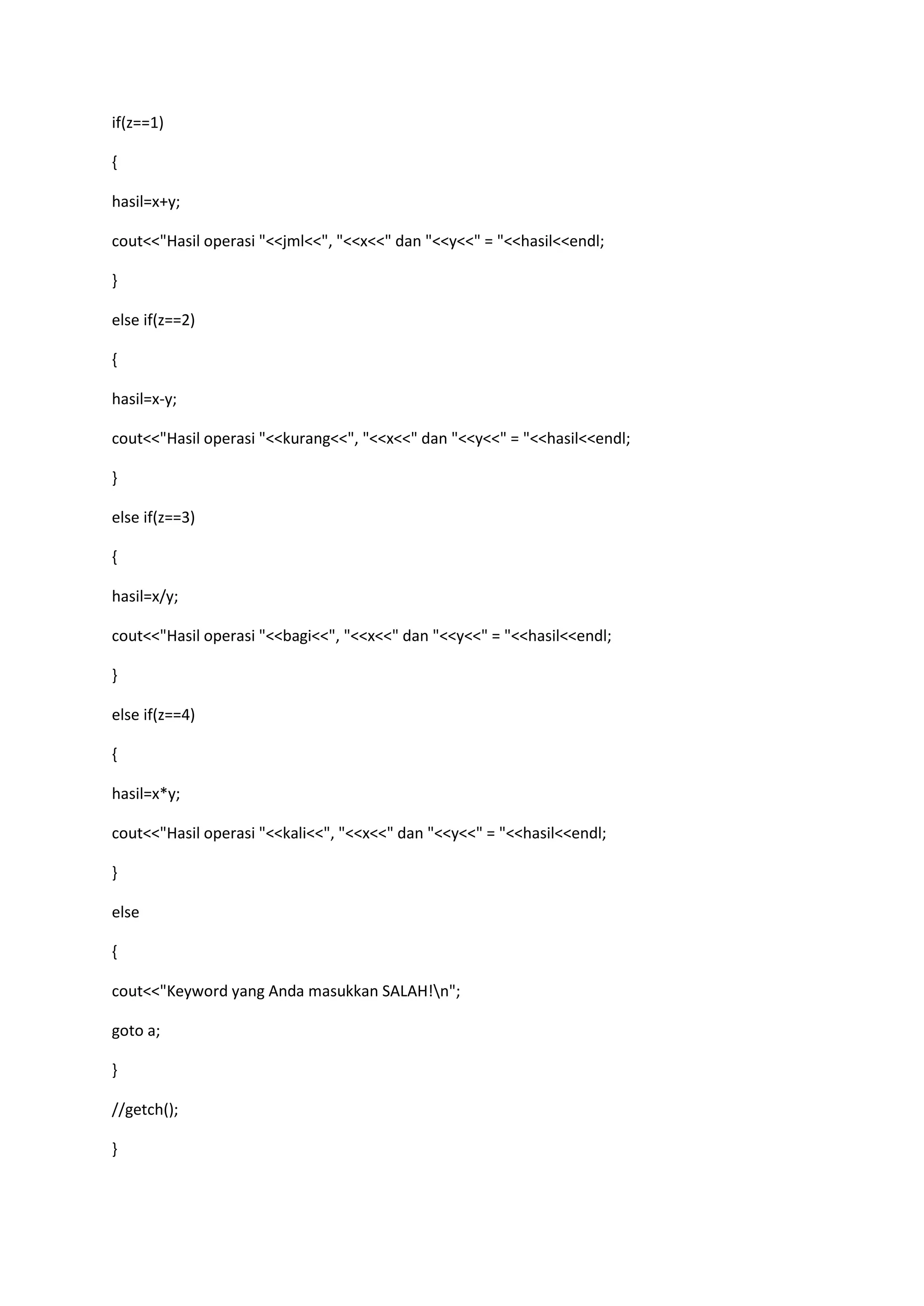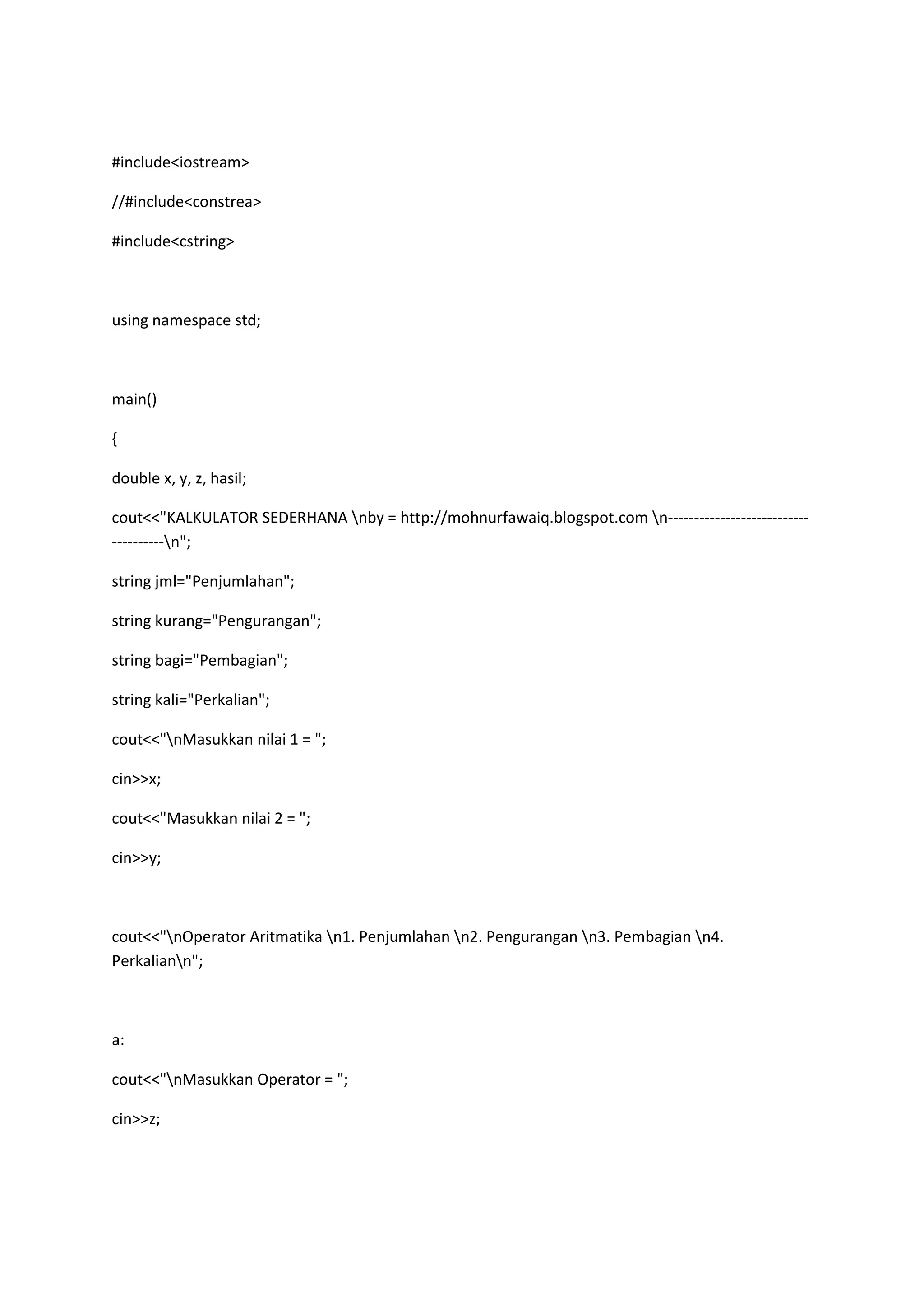 This C++ program allows a user to perform basic arithmetic operations. The user inputs two numbers and selects an operator: addition, subtraction, division, or multiplication. The program then calculates the result and displays it, identifying the operation and the two input numbers. If an invalid operator is selected, the user is prompted to try again.