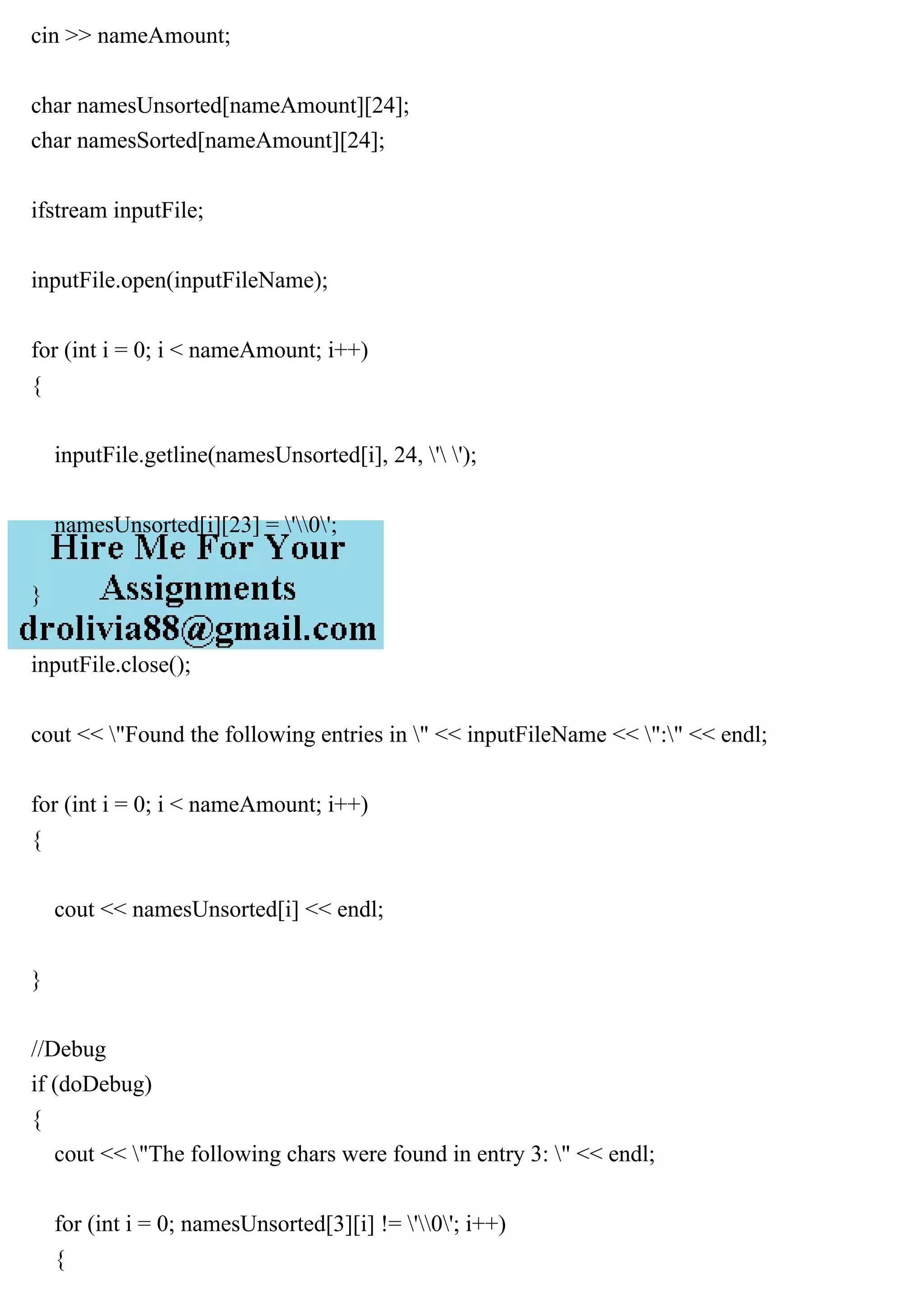 The document contains C++ code for reading a specified number of names from an input file, sorting them alphabetically, and outputting the sorted names to an output file. It includes a debug option and functions for string copying and comparison. The program prompts the user for file names and the count of names to handle.
