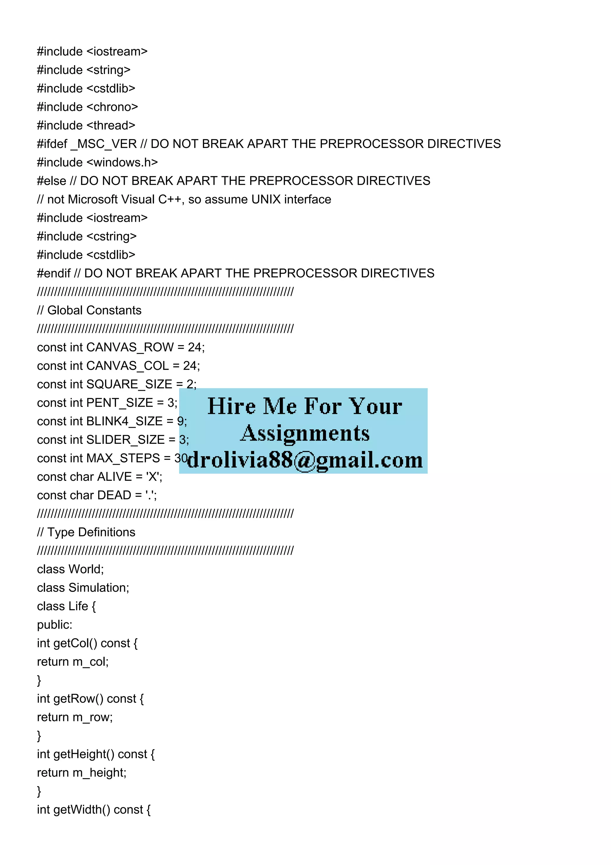 The document describes a C++ implementation of Conway's Game of Life, utilizing classes to represent various life forms and a world to simulate their interactions. It provides instructions for organizing the code into separate header and implementation files, as well as recommendations for enhancing the functionality of the simulation. Additionally, it emphasizes compliance with coding standards and the requirement for compiled code within Visual Studio 2019.