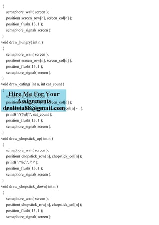The document is a C program that implements the dining philosophers problem using semaphores to coordinate access to chopsticks among philosophers. It initializes semaphores and creates threads for each philosopher, simulating their actions of thinking, eating, and waiting for chopsticks. Finally, it calculates and displays the total meals served and average hungry time after all philosophers have completed their eating.