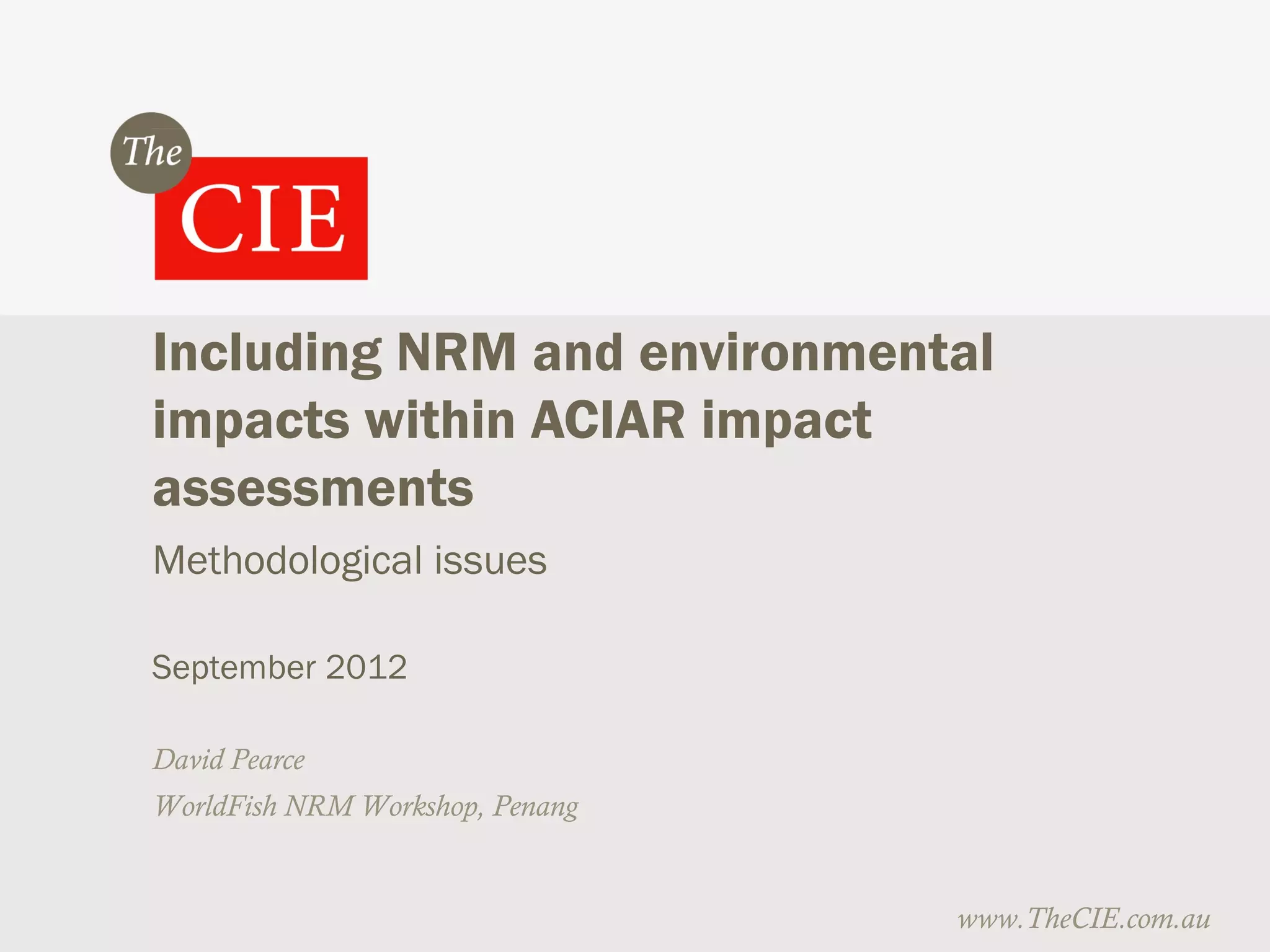 This document discusses methodological issues for incorporating natural resource management (NRM) and environmental impacts within impact assessments for the Australian Centre for International Agricultural Research (ACIAR). It proposes a framework that:
