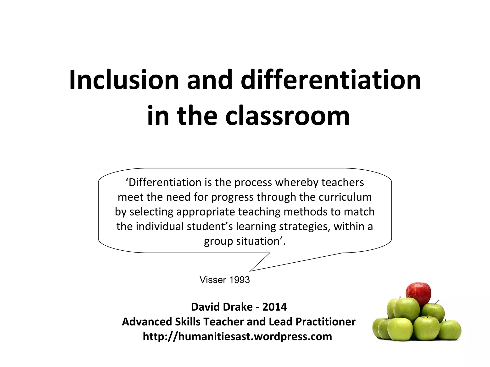 This document discusses strategies for differentiation and inclusion in the classroom. It explains that differentiation is meeting students' individual needs through appropriate teaching methods within a group setting. It recommends using a mix of mastery tasks, which all students can achieve, and developmental tasks, which stretch higher-ability students. Mastery tasks involve knowledge and comprehension, can be achieved quickly, and ensure all students experience success. Developmental tasks are more difficult and dependent on prior learning. The document provides examples of each and suggests breaking down complex tasks into scaffolded steps using Bloom's Taxonomy as a learning ladder. It also discusses strategies for supporting student writing, such as writing frames, and ways to improve inclusion, such as using a variety of questioning techniques
