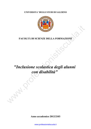 Il documento analizza l'evoluzione dell'inclusione scolastica per alunni con disabilità, dal periodo di esclusione e separazione fino all'attuale approccio inclusivo. Vengono esplorate le dimensioni sociologiche, psicologiche, pedagogiche e didattiche dell'intervento educativo, evidenziando le pratiche e i modelli di successo. Infine, si discutono i soggetti coinvolti e gli strumenti necessari per garantire un'educazione inclusiva di qualità.