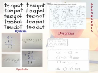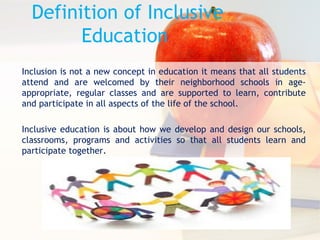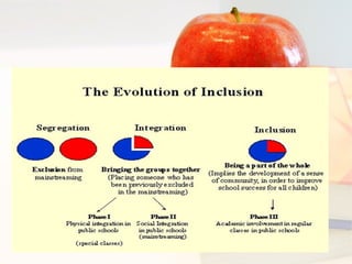 This document discusses inclusive education for students with learning disabilities in regular schools. It defines inclusive education as all students attending their neighborhood schools and being supported to learn together. Students with conditions like dyslexia, ADHD, autism and others are discussed. The challenges they face include health problems, lack of funding, inappropriate environments and attitudes. Schools problems include poor teacher training and attitudes, inflexible methods and lack of support. An inclusive approach emphasizes learning for all with flexible individualized teaching, while traditional approaches are more exclusive and limiting. The conclusion advocates for adjusting education systems to meet all children's needs through inclusive practices.