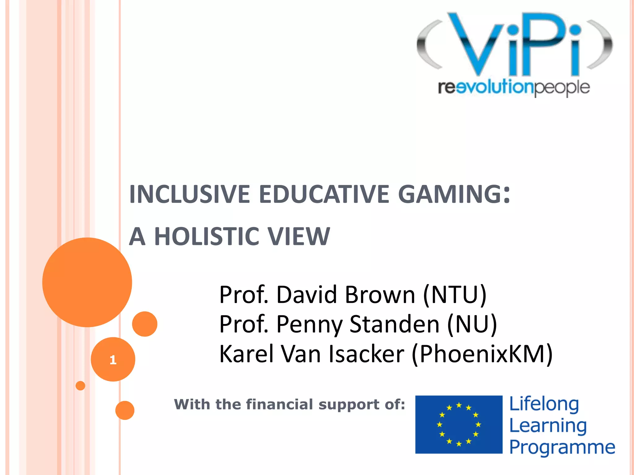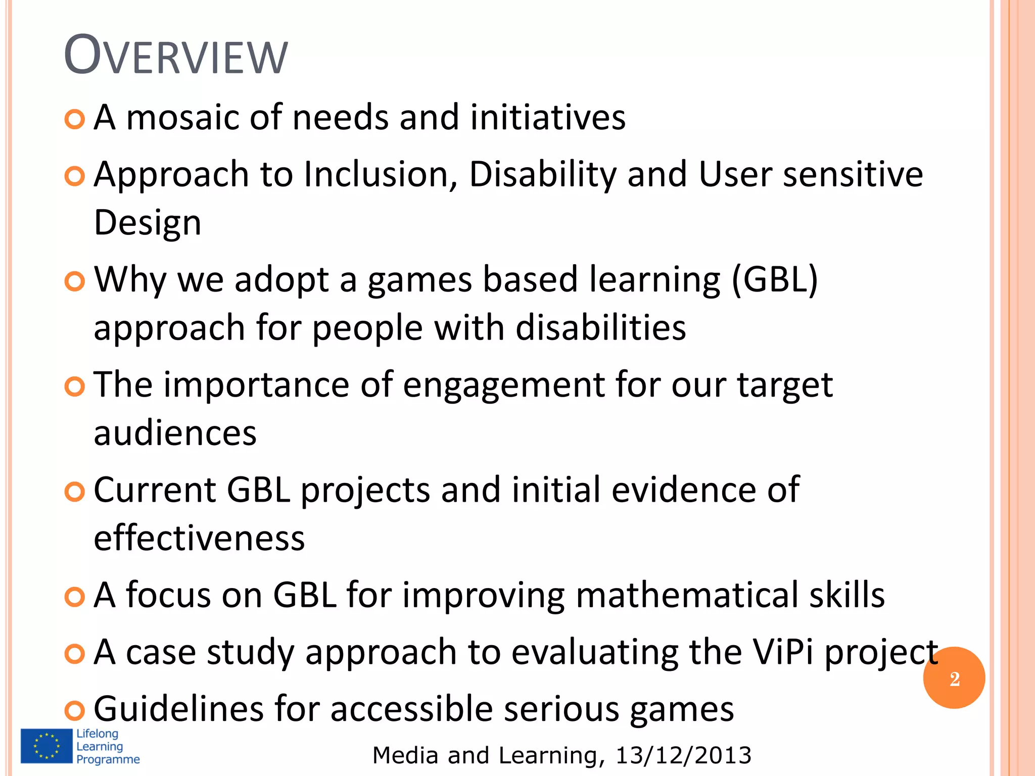 The document discusses the development of inclusive educative gaming aimed at improving learning outcomes for people with disabilities through a games-based learning approach. It emphasizes the importance of user involvement in the design process and presents evidence from current projects, including the Virtual Portal for Interaction (VIPI), which shows positive impacts on ICT skills and engagement levels among users. Additionally, the document outlines guidelines for creating accessible serious games to better meet the needs of diverse learners.