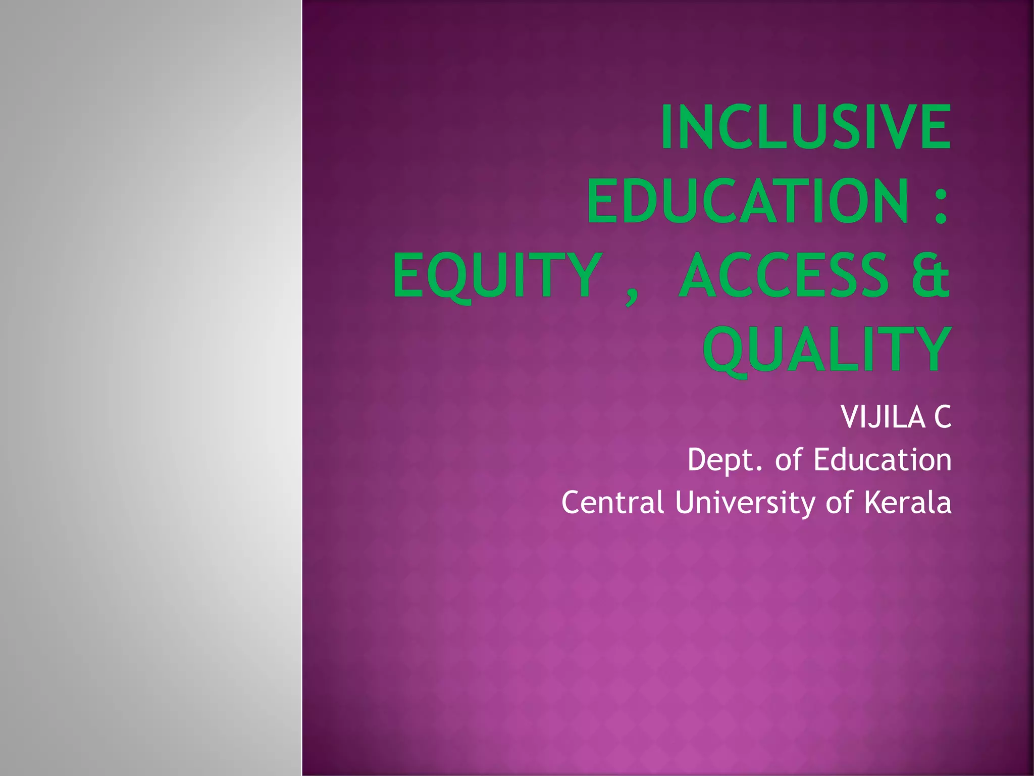 The document discusses the history and development of inclusive education in India. It outlines key milestones like the Persons with Disabilities Act of 1995 which promotes integrating students with disabilities into regular classrooms. Major schemes to promote inclusion are discussed, such as the Integrated Education for Disabled Children scheme, Sarva Shiksha Abhiyan, and the Inclusive Education of the Disabled at Secondary Stage scheme. The benefits of inclusion for all students and types of support services needed are also summarized.