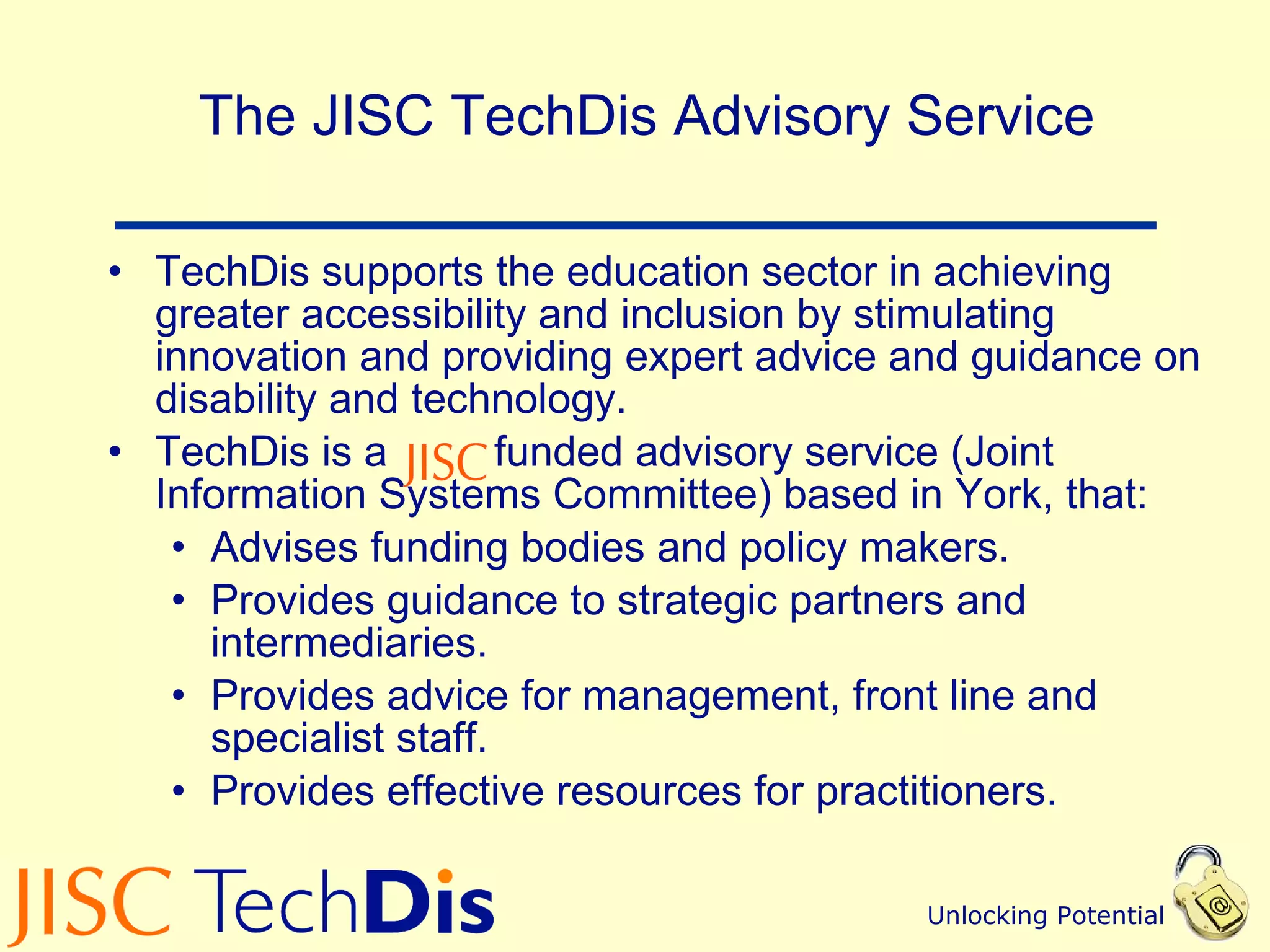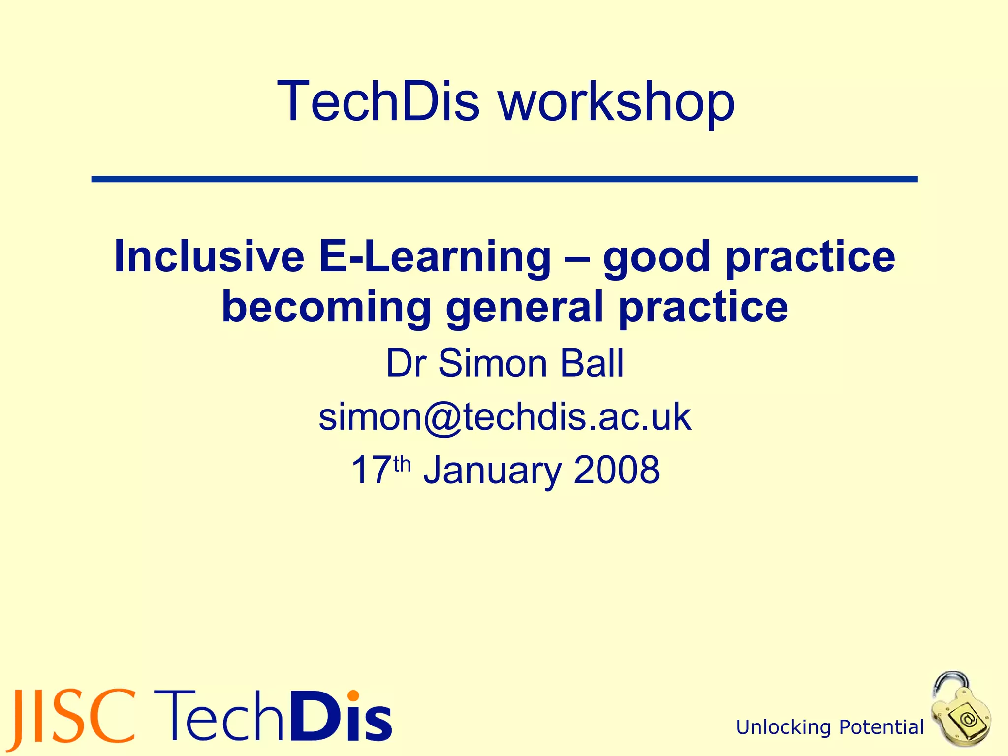 The document summarizes resources from the TechDis workshop on inclusive e-learning and good practices for accessibility. It provides examples of funding opportunities for technologies that promote inclusion, such as podcasting and tactile diagrams. It also lists free and open-source assistive technologies and simulations that can help understand disabilities. Overall, the document aims to promote holistic and accessible approaches to e-learning.