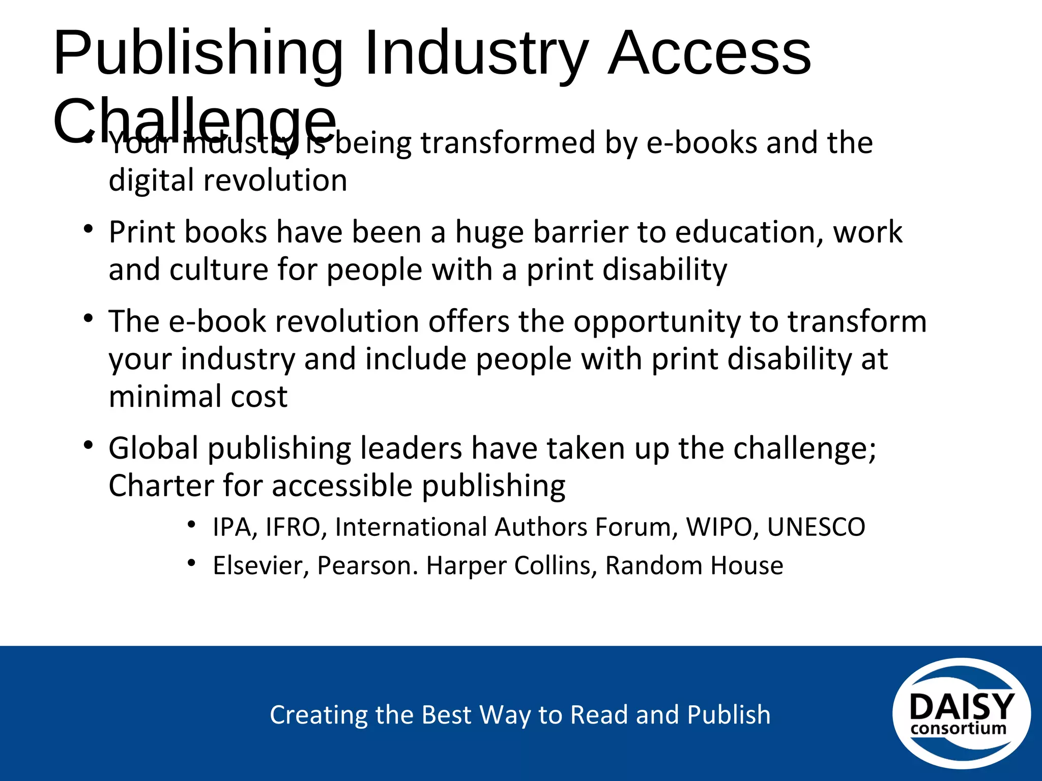 Stephen King, President of the DAISY Consortium, discusses how EPUB 3 and inclusive publishing can revolutionize accessibility in the market. He explains that print disabilities exclude many from education and culture. While e-books increase access, the experience remains poor. EPUB 3, with accessibility built-in, provides business benefits by reaching more customers with efficient multi-format publishing. Publishers who adopt EPUB 3 standards and partner with specialized producers can play a role in the "market accessibility revolution" while improving their business.