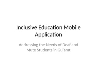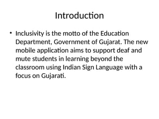 The mobile application developed for deaf and mute students in Gujarat aims to enhance learning through Indian Sign Language and provide resources for practicing at home. Key features include exercises in writing, math, and science, as well as tools for converting text and speech to sign language, promoting inclusivity in education and employment. This digital platform will aid students' learning, support parents, and allow teachers to track progress effectively.