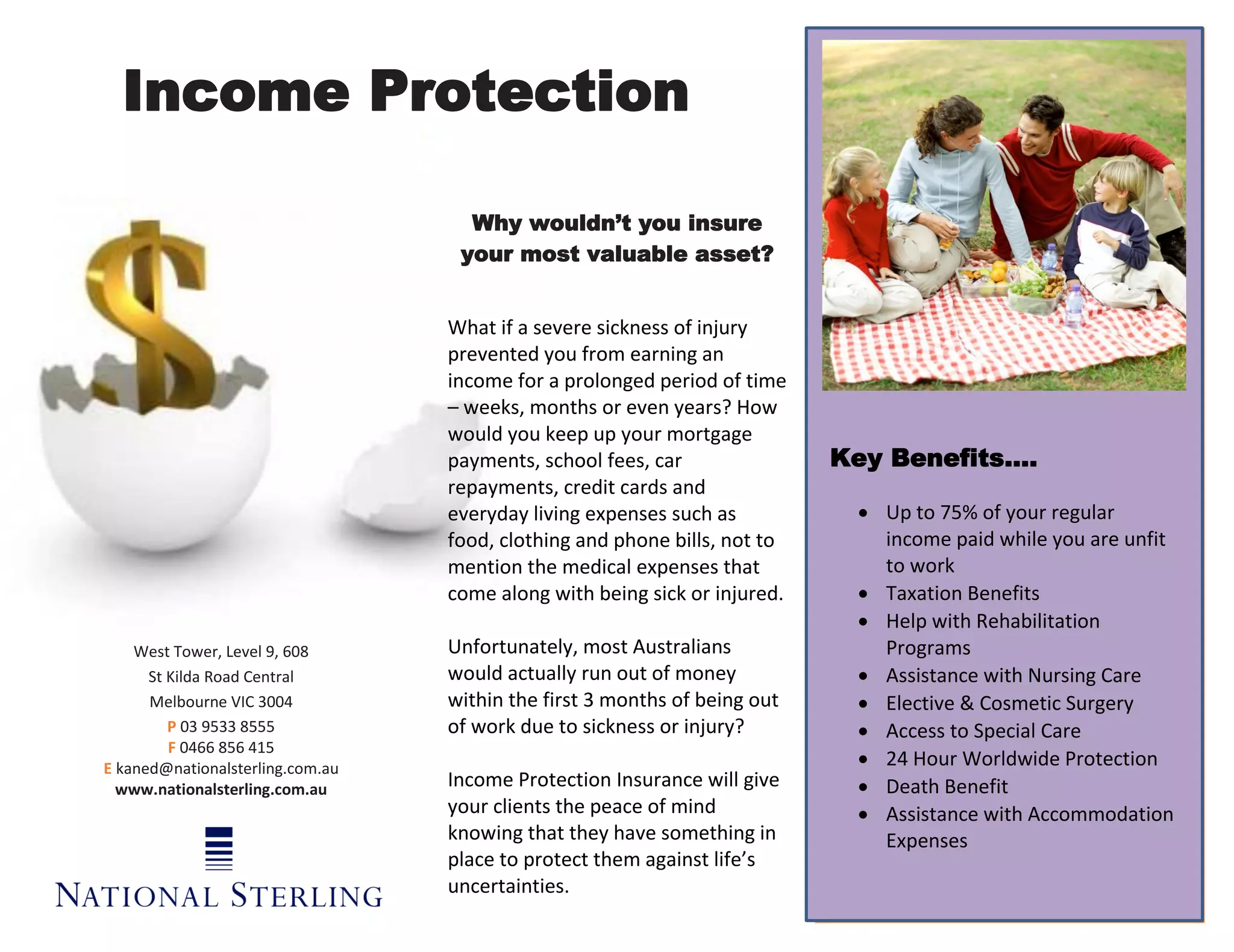 Income protection insurance provides payments to individuals who are unable to work due to sickness or injury. It can cover up to 75% of regular income and help cover living expenses like mortgages, bills, and medical costs. Without income protection insurance, most Australians would run out of money within 3 months of being unable to work. Income protection insurance offers benefits like income payments, tax advantages, rehabilitation assistance, nursing care, worldwide coverage, and a death benefit to provide financial security during times of illness or injury.