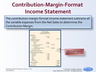 The document discusses income statements, their purpose and key components. It explains that income statements are prepared periodically to show business performance and include revenue, costs of goods sold, gross profit, operating expenses, pre-tax profit and net profit. It also discusses the importance of cash flow for entrepreneurs and calculating a company's burn rate to understand how long it can operate without generating revenue.