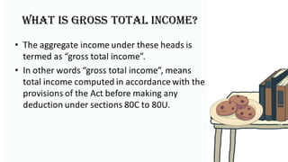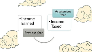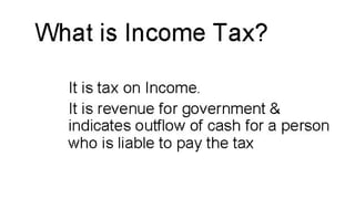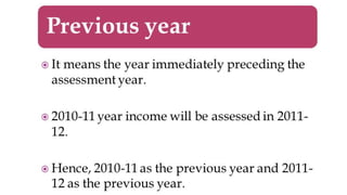 This document provides an outline for a presentation on income tax concepts in India. It begins with an introduction to income tax and outlines key topics to be covered, including definitions of person and income. It then lists 5 situations where income may be taxed in the same previous year, such as for non-resident ship owners, persons leaving India, or those likely to transfer assets to avoid tax.