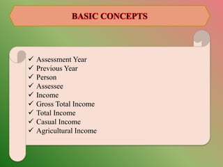 This document defines key terms related to income tax in India. It explains that the assessment year is the year following the financial year in which income is assessed. The previous year is the financial year in which income is earned. It defines who qualifies as a person, assessee, representative assessee, and deemed assessee for income tax purposes. It also explains how gross total income, total income, casual income, and agricultural income are defined and treated for income tax.
