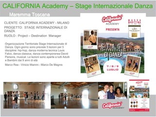 Il documento presenta diversi progetti di eventi sportivi e vacanze attive in Toscana e in altre località italiane, collaborando con vari comuni e aziende. Include iniziative come un triathlon sulla costa degli Etruschi, microvacanze fitness e camp estivi per giovani, integrando sport e turismo. La finalità è promuovere benessere e attività sportive attraverso eventi ricreativi estivi e invernali.
